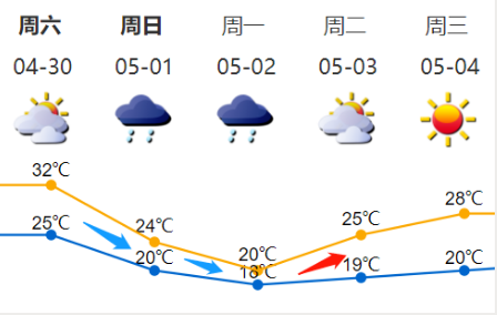 • 5月1-2日有陣雨局部大雨,氣溫下降4-5℃,沿海高地和海區(qū)有7-8級陣風(fēng);