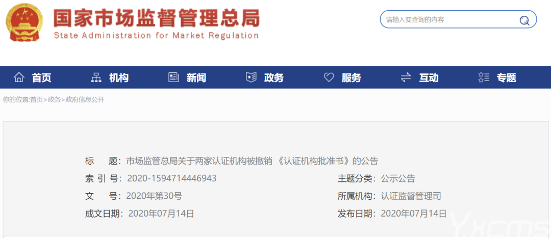 市場(chǎng)監(jiān)管總局關(guān)于兩家認(rèn)證機(jī)構(gòu)被撤銷《認(rèn)證機(jī)構(gòu)批準(zhǔn)書》的公告