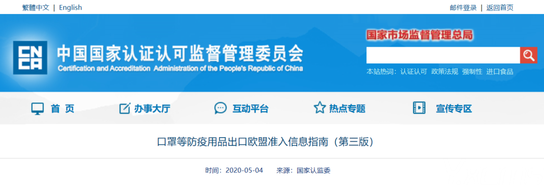 昨日,國家認(rèn)監(jiān)委發(fā)布第三版口罩等防疫用品出口歐盟準(zhǔn)入信息指南,全文如下: